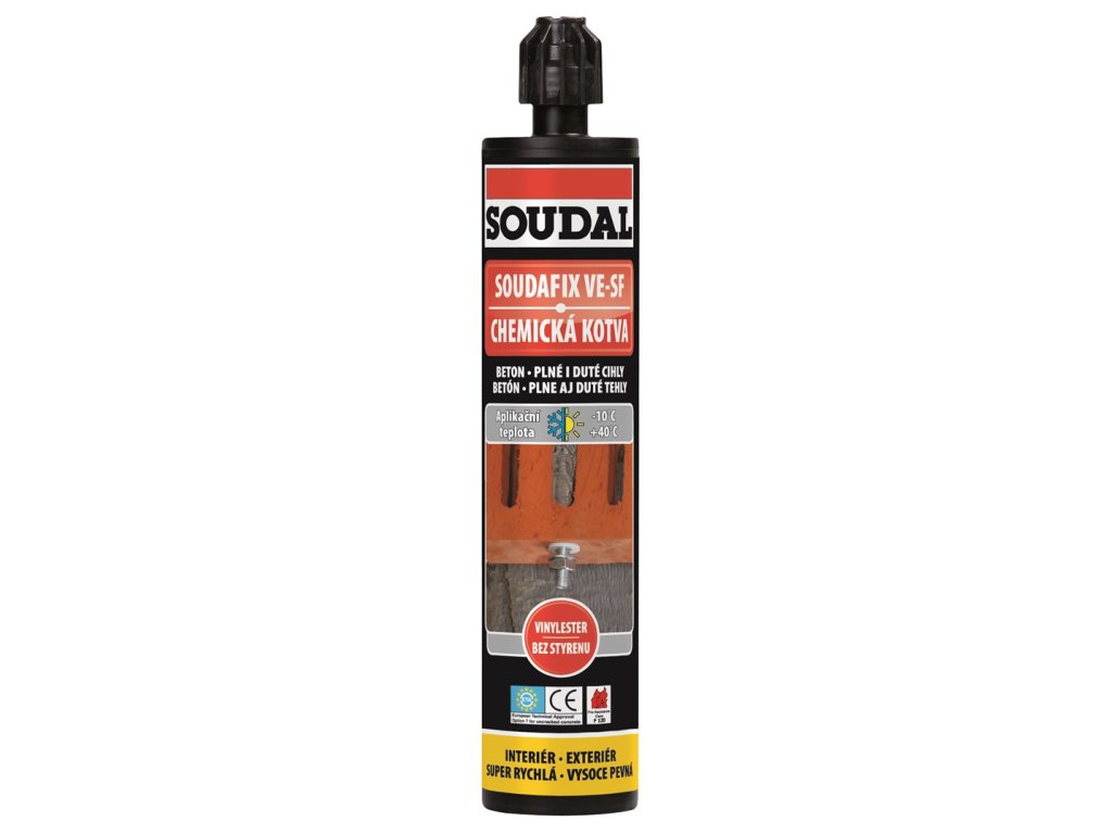 Soudal, vysoce kvalitní kotvící malta na bázi vinylesterové praskyřice. Snadno použitelná, rychle tuhnoucí, bez styrenu, použitelná i na mokré zdivo. Určena pro rychlé, pevné, vodotěsné a vodě odolné kotvení, tuhne i pod vodou. Opakovatelně použitelná (po výměně směšovací trysky)