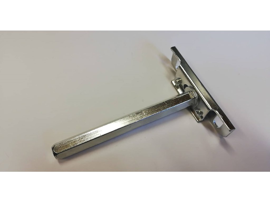 Trn dlouhý 112mm, s dvěma otvory a uchycení do zdi (pomocí hmoždinky, možnost výškové + stranové regulace a regulace úhlu mezi zdí a policí ( pomocí šroubování trnu proti plechu)